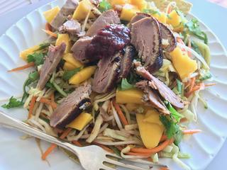 Method: Prepare salad and dress when ready to eat. Top with duck, mango and almond flakes. Season and top with chutney or relish – I use plum chutney. Leftover dressing can be refrigerated.